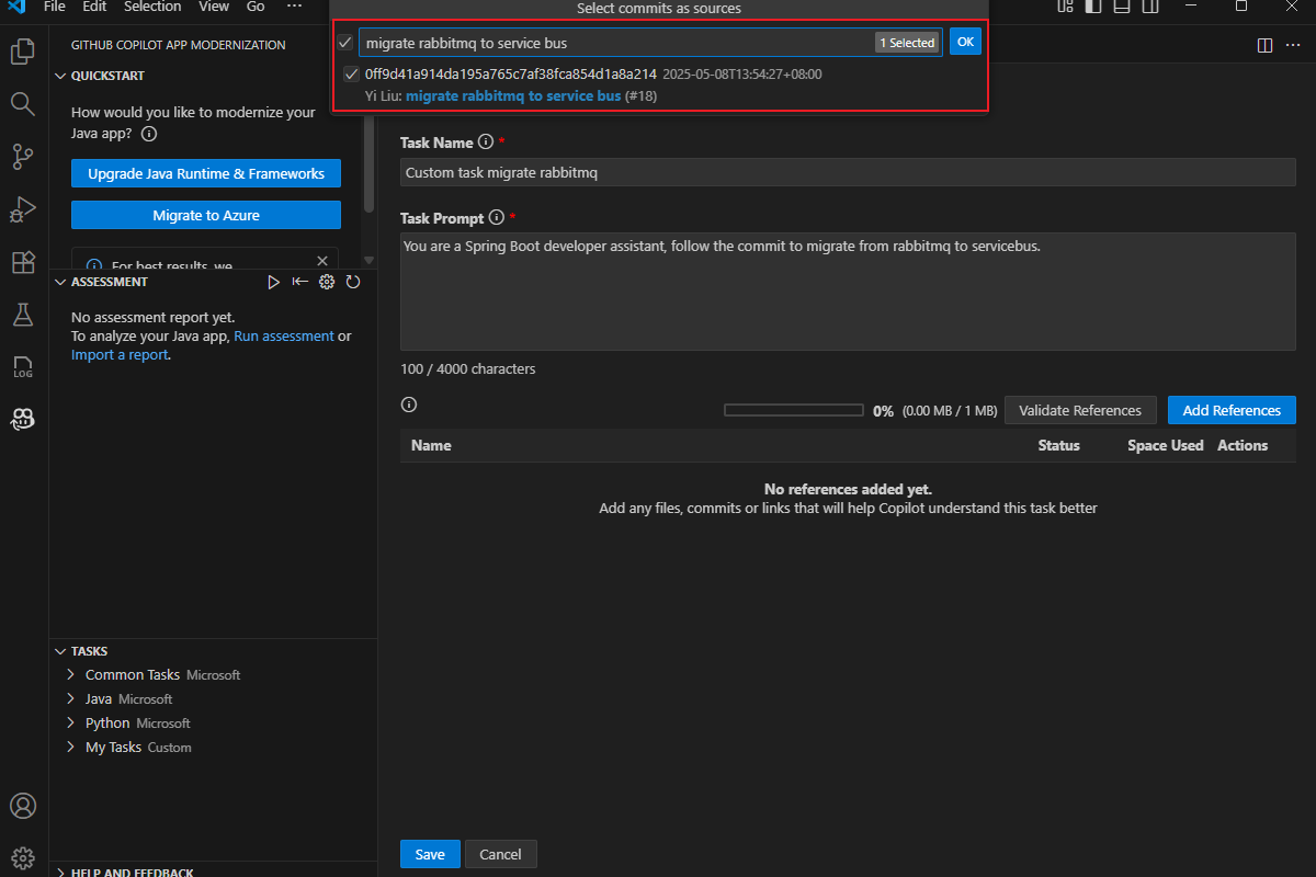task.mdfile opens. In the Task Name field, enter Custom task migrate rabbitmq. In the Task Prompt field, enter You are a Spring Boot developer assistant, follow the commit to migrate from rabbitmq to servicebus.Select Add References and then select Git commits in the pop-up dialog box.