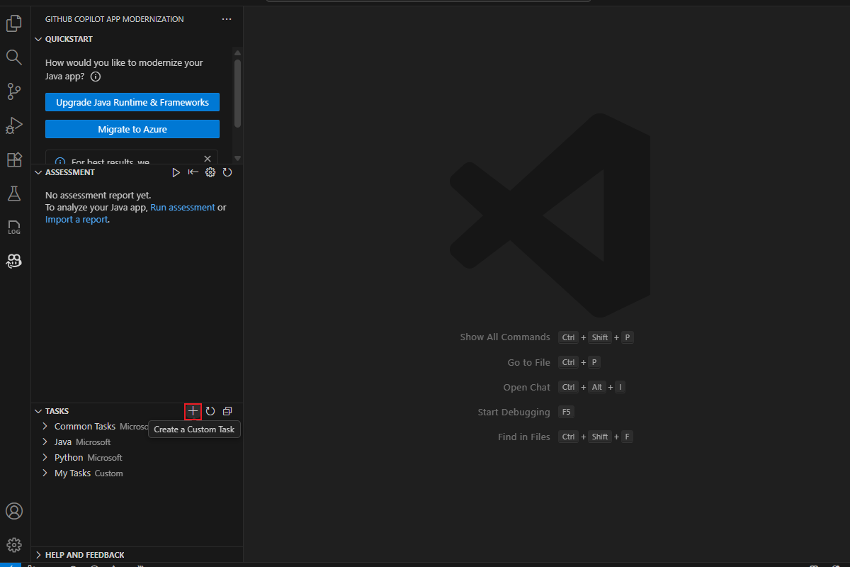 This quickstart shows you how to create and apply your own tasks when you use GitHub Copilot app modernization.
