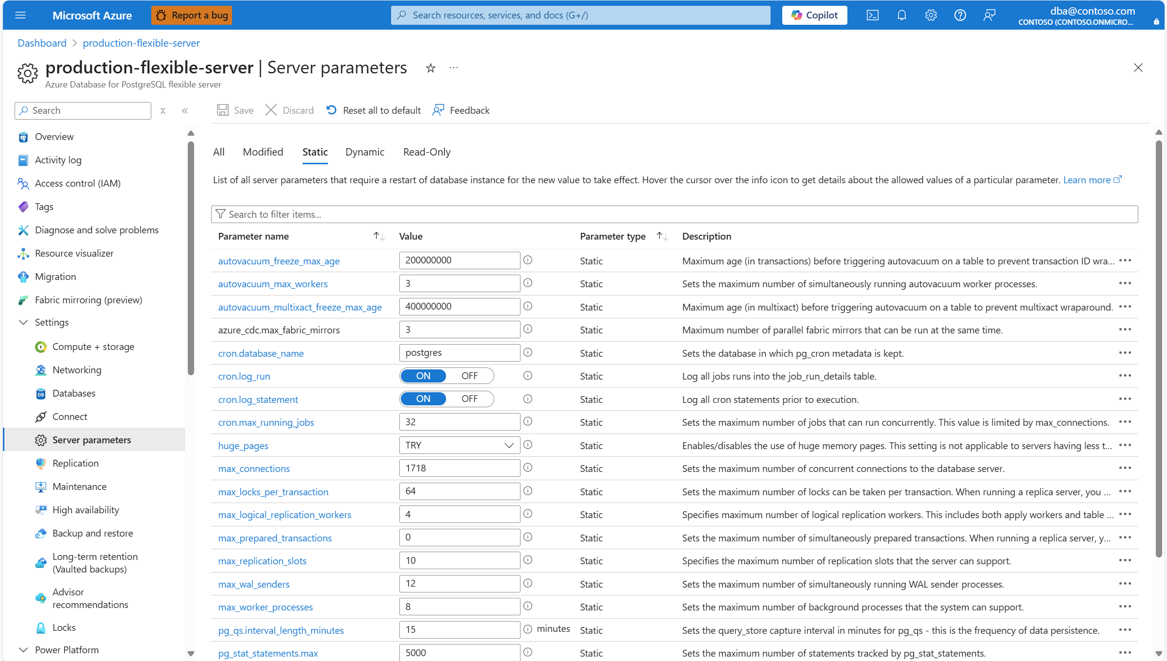 This article provides step-by-step instructions to list read-write static server parameters of an Azure Database for PostgreSQL flexible server.