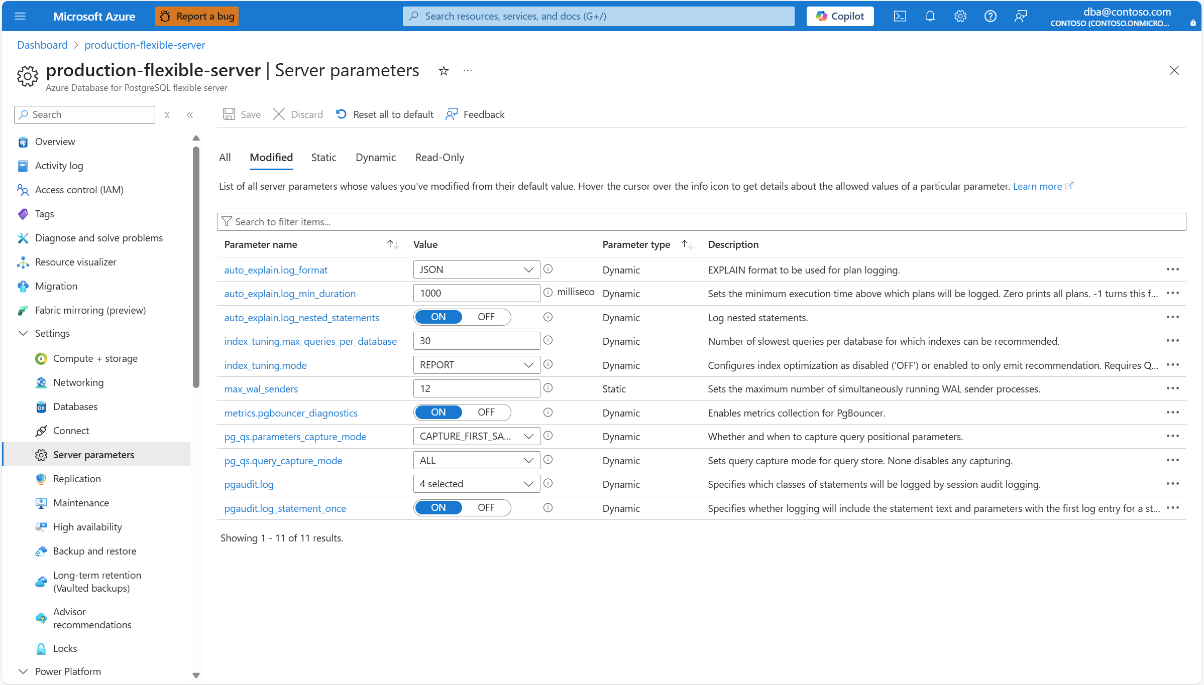 In the resource menu, under Settings, select Server parameters.