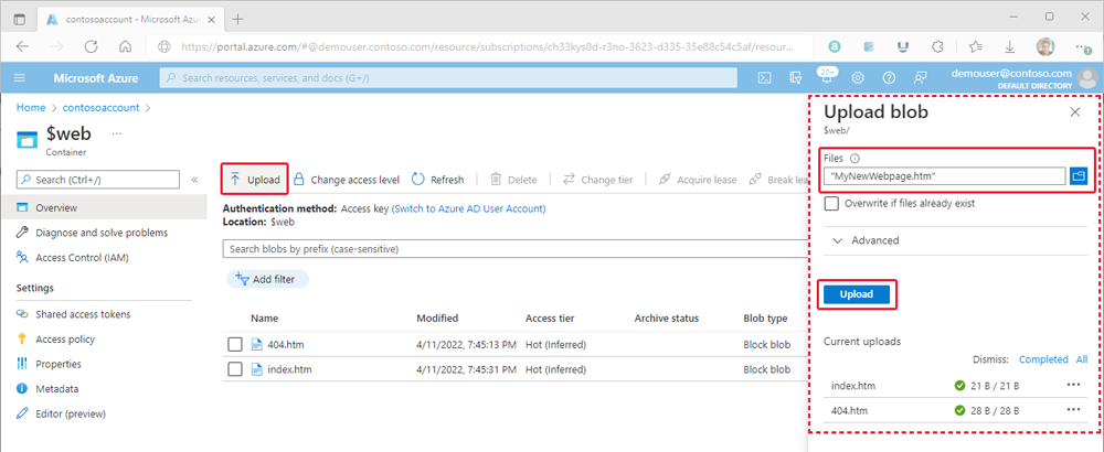 The following instructions show you how to upload files by using the Azure portal. You could also use AzCopy, PowerShell, CLI, or any custom application that can upload files to the $web container of your account. For a step-by-step tutorial that uploads files by using Visual Studio code, see Tutorial: Host a static website on Blob Storage.