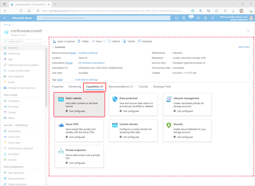 3. In the Overview pane, select the Capabilities tab. Next, select Static website to display the configuration page for the static website.