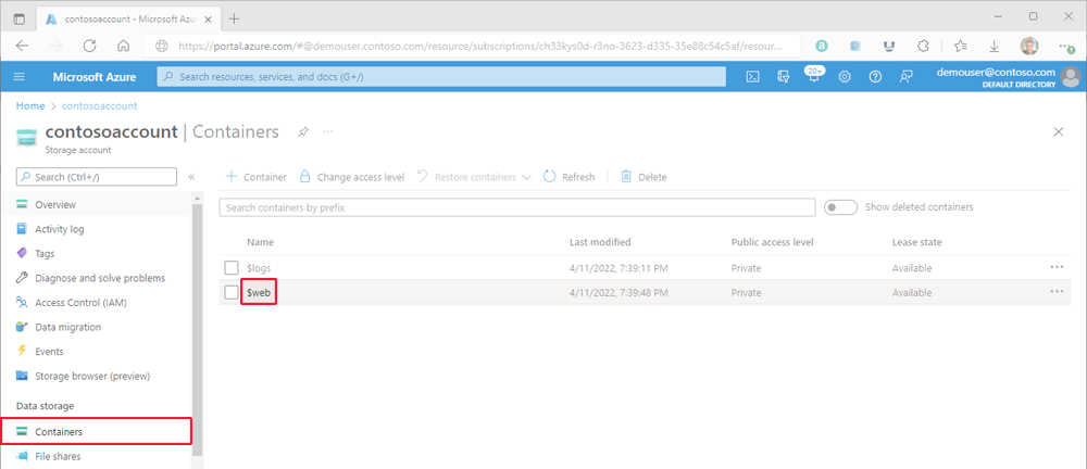 2. In the Containers pane, select the $web container to open the container's Overview pane.