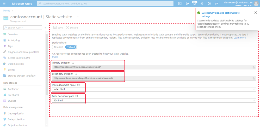 8. A confirmation message is displayed. Your static website endpoints and other configuration information are shown within the Overview pane.