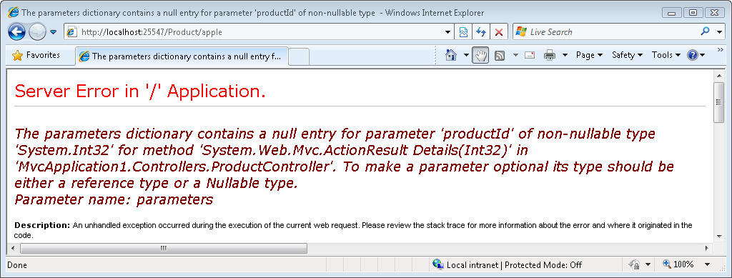 Because the Details() action expects an integer parameter, making a request that contains something other than an integer value will cause an error. For example, if you type the URL /Product/apple into your browser then you will get the error page in Figure 1.