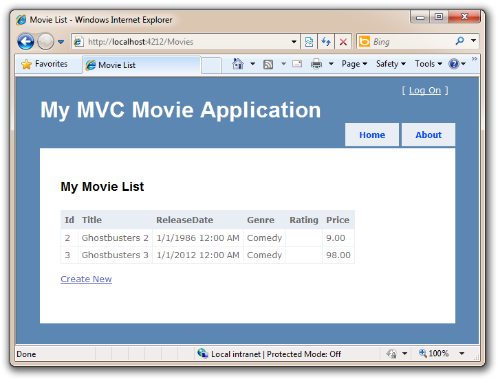 We now have a simple listing of our movie data. However, if we click the "Create New" link, we'll get an error as it's not hooked up! Let's implement a Create Action method and enable a user to enter new movies in our database.