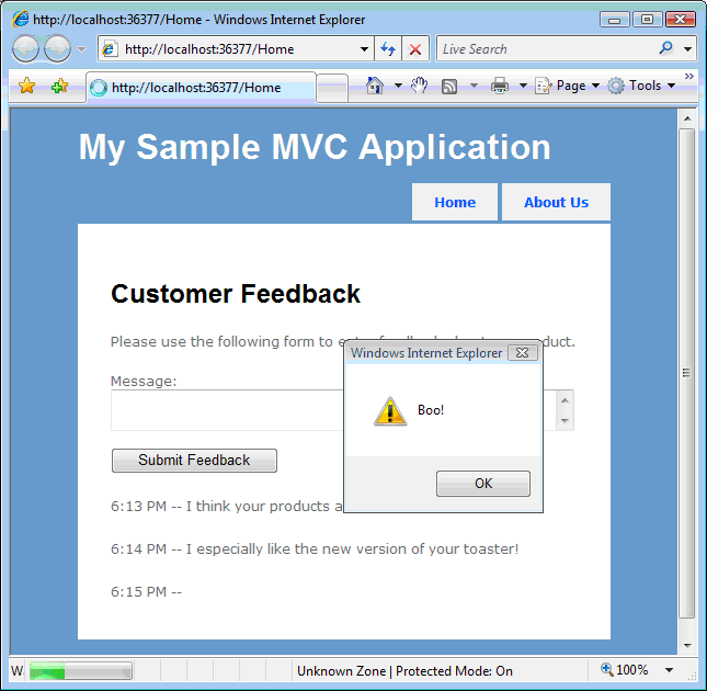 Notice that the value of Message is HTML encoded before the value is submitted to the database within the Create() action. When the Message is redisplayed in the view, the Message is HTML encoded and any JavaScript injected in the Message is not executed.