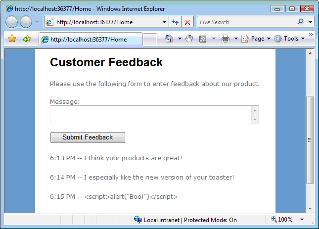 Imagine that you have created a customer feedback website (see Figure 1). Customers can visit the website and enter feedback on their experience using your products. When a customer submits their feedback, the feedback is redisplayed on the feedback page.