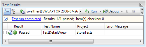 You can run the unit test in Listing 2 by either entering the keyboard combination Ctrl-R, A or by clicking the Run All Tests in Solution button (see Figure 1). If the test passes, you'll see the Test Results window in Figure 2.