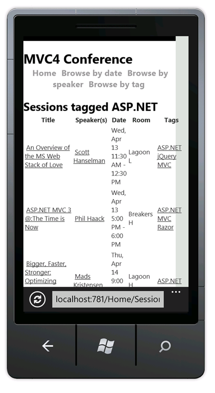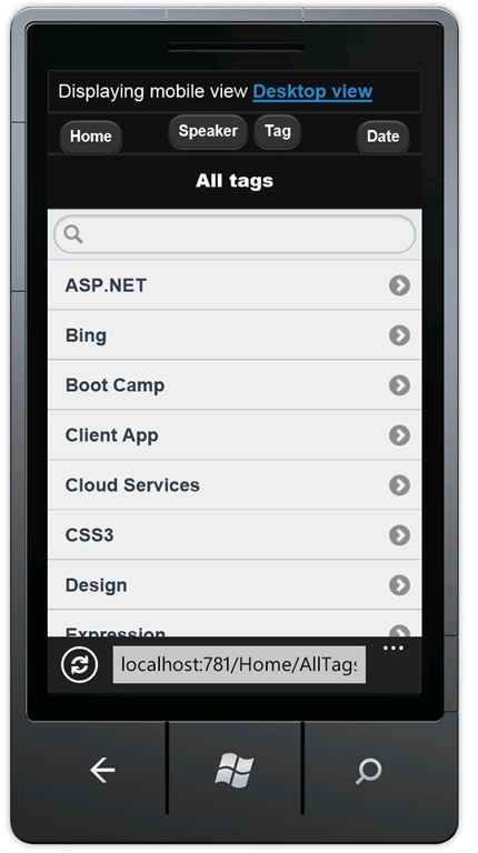 Press CTRL+F5 to run the application, which will display it in your desktop browser. Start your mobile browser emulator, copy the URL for the conference application into the emulator, and then click the Browse by tag link. If you are using the Windows Phone Emulator, click in the URL bar and press the Pause key to get keyboard access. The image below shows the AllTags view (from choosing Browse by tag).