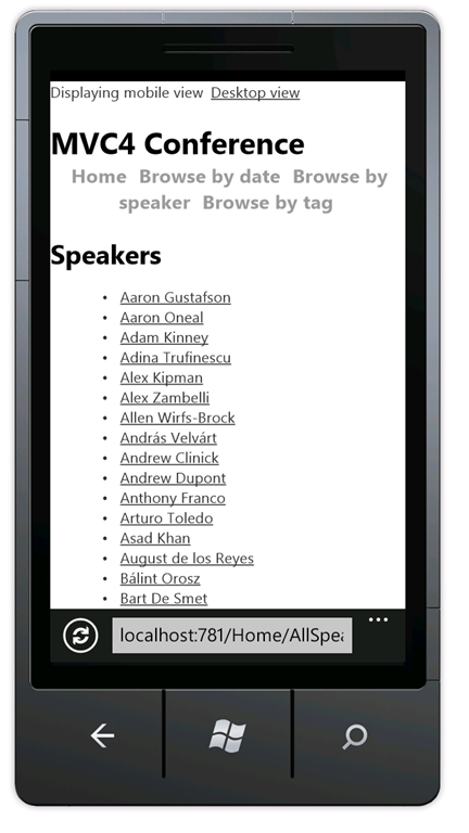 In the mobile browser, select the Speakers link. Because there's no mobile view(AllSpeakers.Mobile.cshtml), the default speakers display (AllSpeakers.cshtml) is rendered using the mobile layout view (_Layout.Mobile.cshtml).