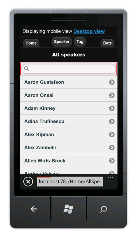 As you just saw, the Speakers view is readable, but the links are small and are difficult to tap on a mobile device. In this section, you'll create a mobile-specific Speakers view that looks like a modern mobile application — it displays large, easy-to-tap links and contains a search box to quickly find speakers.