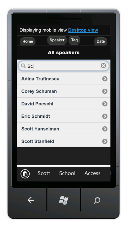 Finally, you'll create a mobile-specific view of the SessionByCode view. In the mobile browser, tap the Speaker button, then enter Sc in the search box.