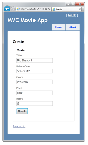 Click Create. The new movie, including the rating, now shows up in the movies listing: