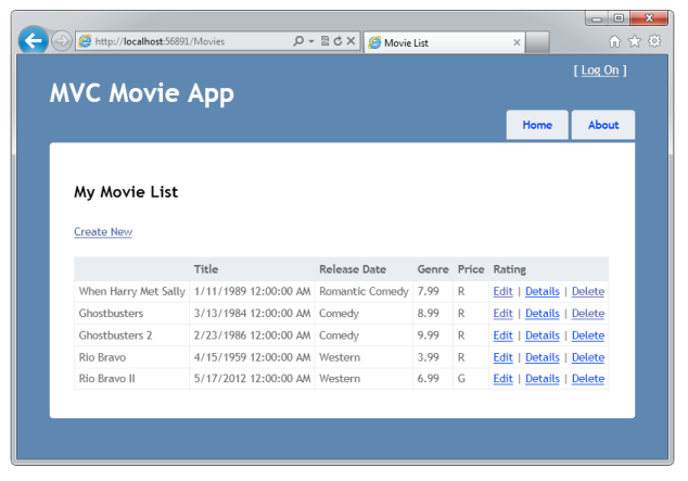 Re-run the application and navigate to the /Movies URL. When the application starts, it detects that the model structure no longer matches the database schema. It automatically re-creates the database to match the new model structure and populates the database with the sample movies: