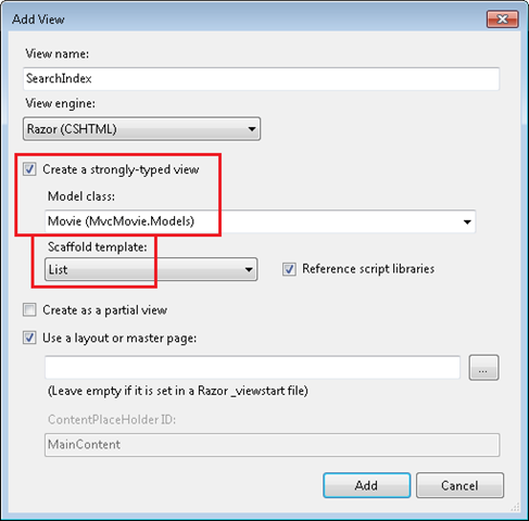 Now you can implement the SearchIndex view that will display the form to the user. Right-click inside the SearchIndex method and then click Add View. In the Add View dialog box, specify that you're going to pass a Movie object to the view template as its model class. In the Scaffold template list, choose List, then click Add.