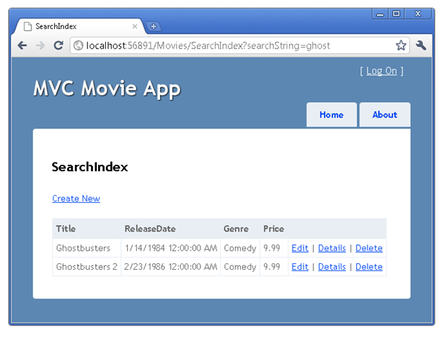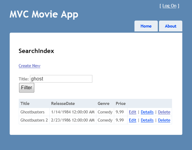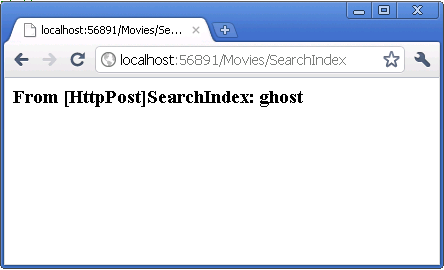 Run the application and navigate to /Movies/SearchIndex. Append a query string such as ?searchString=ghost to the URL. The filtered movies are displayed.