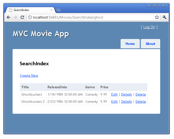 In this section, you'll examine the generated action methods and views for the movie controller. Then you'll add a custom search page.
