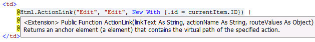 Screenshot shows the Html.ActionLink in a code editor.