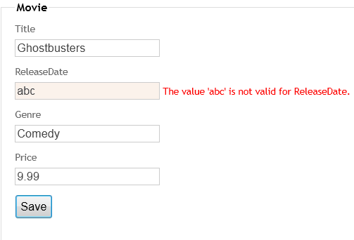 Run the application and navigate to the /Movies URL. Click an Edit link. In the browser, view the source for the page. The HTML in the page looks like the following example. (The menu markup was excluded for clarity.)