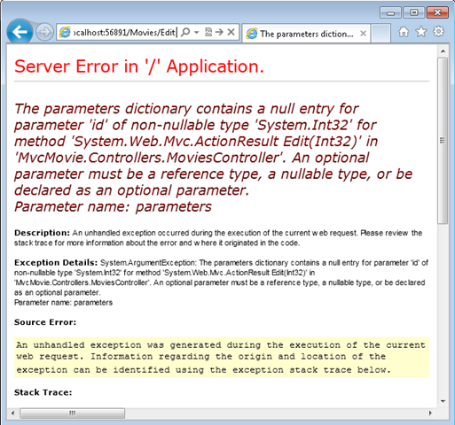 The HttpGet Edit method generated by the scaffolding system doesn't check that the ID that's passed to it is valid. If a user removes the ID segment from the URL (http://localhost:xxxxx/Movies/Edit), the following error is displayed: