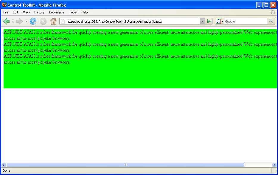Then, add the AnimationExtender to the page, providing an ID, the TargetControlID attribute and the obligatory runat="server":