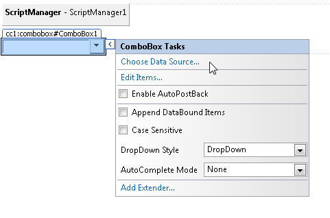 If you want to use the ComboBox control in the page then you must add a ScriptManager control to the page. Drag the ScriptManager control from beneath the AJAX Extensions tab onto the Designer surface. You should add the ScriptManager control at the top of the page; you can add it immediately below the opening server-side <form> tag.