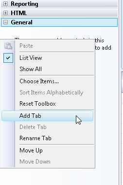 - Right-click the Toolbox beneath the General Tab and select the menu option Add Tab (see Figure 4).