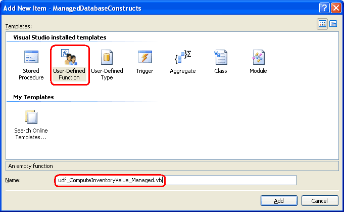 To add a managed UDF to the ManagedDatabaseConstructs project, right-click on the project name in Solution Explorer and choose to Add a New Item. Select the User-Defined Template from the Add New Item dialog box and name the new UDF file udf_ComputeInventoryValue_Managed.vb.