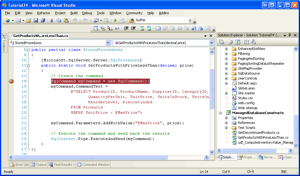 Imagine that we wanted to debug the GetProductsWithPriceLessThan managed stored procedure. We would start by setting a breakpoint within the code of the GetProductsWithPriceLessThan method.
