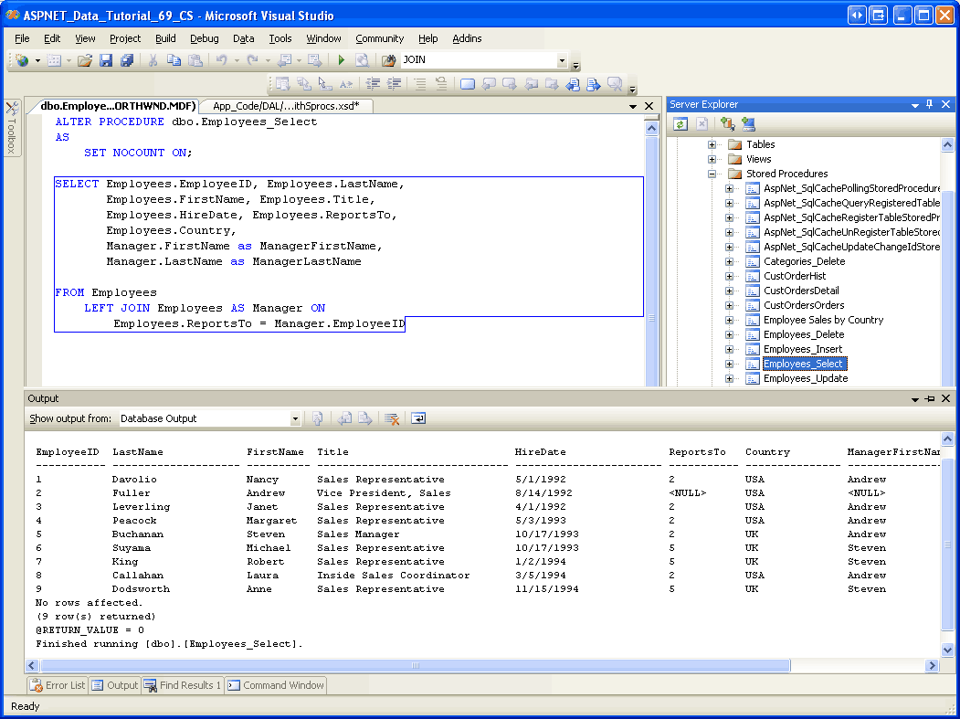 Start by going to the Server Explorer, drilling down into the Northwind database s Stored Procedures folder, and opening the Employees_Select stored procedure. If you do not see this stored procedure, right-click on the Stored Procedures folder and choose Refresh. Update the stored procedure so that it uses a LEFT JOIN to return the manager s first and last name: