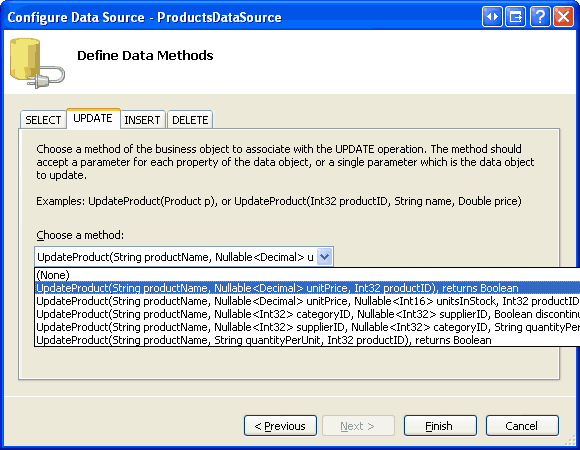 Finally, set the drop-down lists in the INSERT and DELETE tabs to (None) and click Finish. Upon completing the Configure Data Source wizard, Visual Studio sets the ObjectDataSource s OldValuesParameterFormatString property to original_{0}. As discussed in the An Overview of Inserting, Updating, and Deleting Data tutorial, this property needs to be removed from the declarative syntax or set back to its default value, {0}, in order for our update workflow to proceed without error.