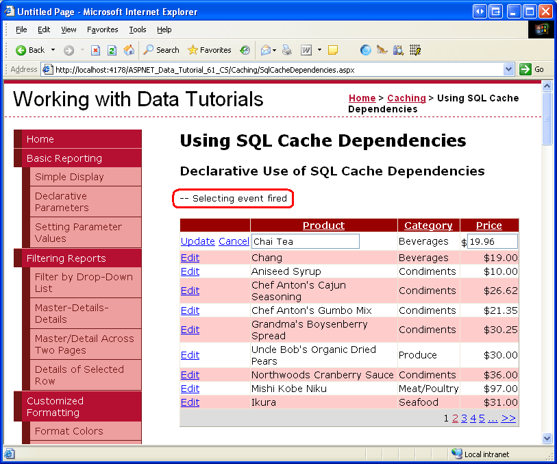 After paging through the grid and noting the lack of the 'Selecting event fired text, open a new browser window and navigate to the Basics tutorial in the Editing, Inserting, and Deleting section (~/EditInsertDelete/Basics.aspx). Update the name or price of a product. Then, from to the first browser window, view a different page of data, sort the grid, or click a row s Edit button. This time, the 'Selecting event fired should reappear, as the underlying database data has been modified (see Figure 10). If the text does not appear, wait a few moments and try again. Remember that the polling service is checking for changes to the Products table every pollTime milliseconds, so there is a delay between when the underlying data is updated and when the cached data is evicted.