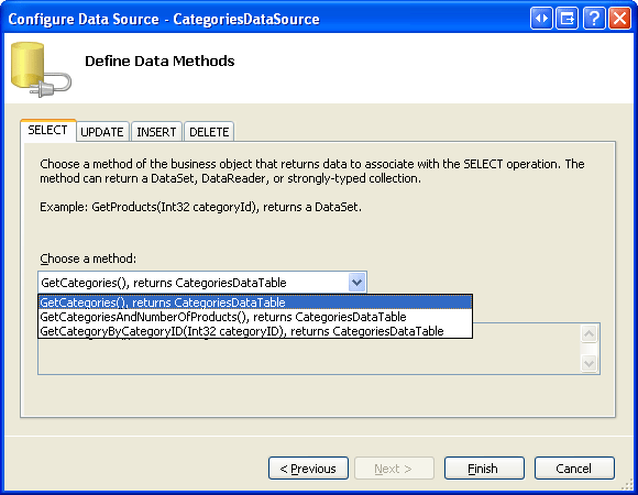 Figure 5: Configure the ObjectDataSource to Use the CategoriesBLL Class s GetCategories() Method (Click to view full-size image)