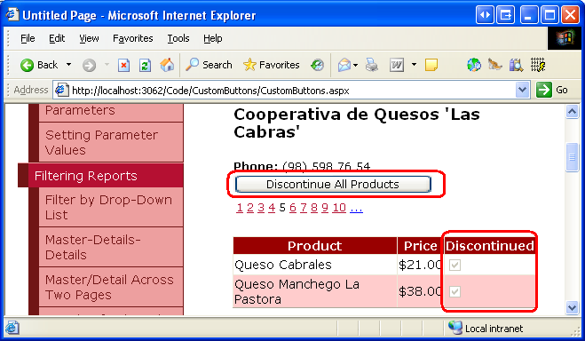 With the ItemCommand event handler created, take a moment to test out the page. Browse to the Cooperativa de Quesos 'Las Cabras' supplier (it's the fifth supplier in the FormView for me). This supplier provides two products, Queso Cabrales and Queso Manchego La Pastora, both of which are not discontinued.