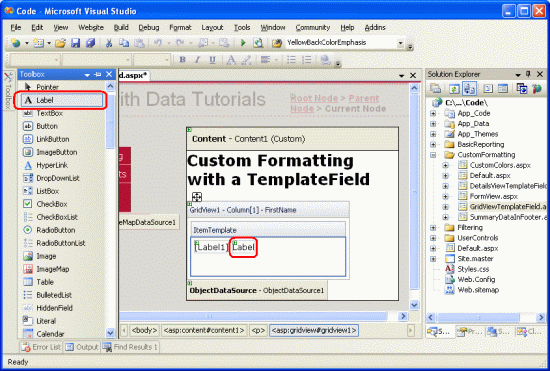In reporting scenarios where you need to use TemplateFields to customize the appearance, I find it easiest to start by creating a GridView control that contains just BoundFields first and then to add new TemplateFields or convert the existing BoundFields to TemplateFields as needed. Therefore, let's start this tutorial by adding a GridView to the page through the Designer and binding it to an ObjectDataSource that returns the list of employees. These steps will create a GridView with BoundFields for each of the employee fields.