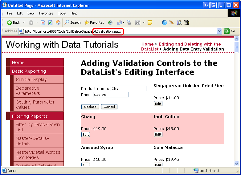 Before we can look at augmenting the previous example to include validation, we first need to replicate the example from the ErrorHandling.aspx page in the EditDeleteDataList folder to the page for this tutorial, UIValidation.aspx. To achieve this we need to copy over both the ErrorHandling.aspx page s declarative markup and its source code. First copy over the declarative markup by performing the following steps:
