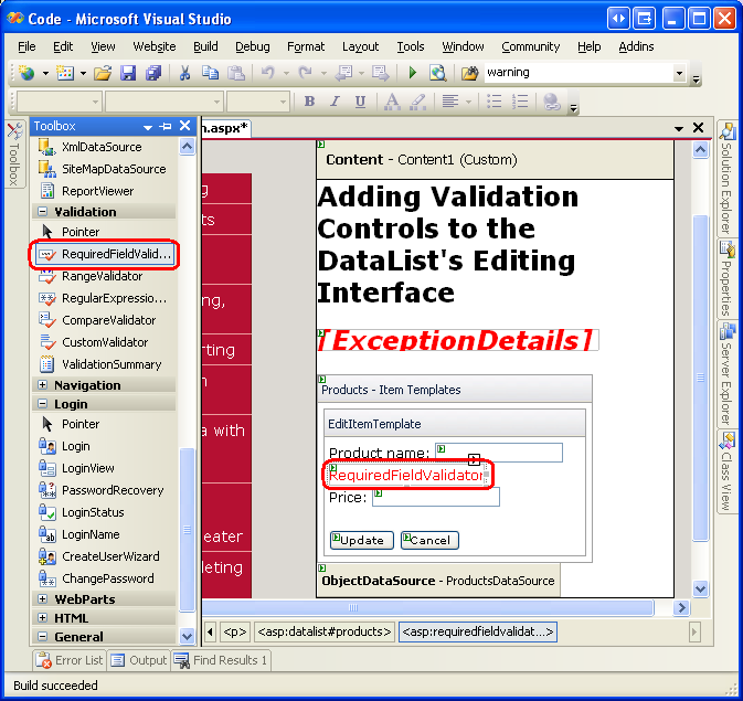 Let s start by adding the necessary validation controls to the DataList s EditItemTemplate. This task can be performed through the Designer by clicking on the Edit Templates link from the DataList s smart tag, or through the declarative syntax. Let s step through the process using the Edit Templates option from the Design view. After choosing to edit the DataList s EditItemTemplate, add a RequiredFieldValidator by dragging it from the Toolbox into the template editing interface, placing it after the ProductName TextBox.
