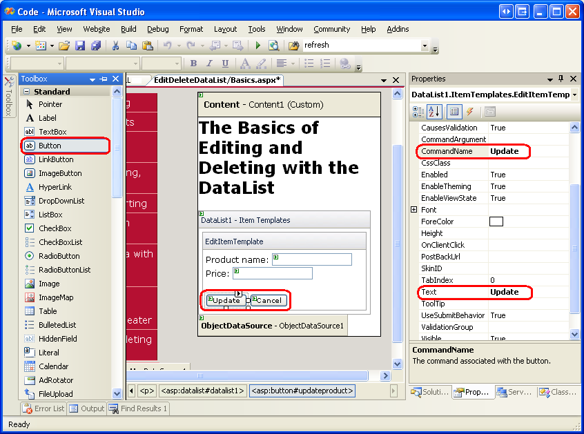 EditItemTemplate. To include deleting support, yet another ObjectDataSource would be needed in theItemTemplate. With this approach, these embedded ObjectDataSource s useControlParametersto declaratively bind the ObjectDataSource s parameters to the user input controls (rather than having to specify them programmatically in the DataList sUpdateCommandevent handler). This approach still requires a bit of code we need to call the embedded ObjectDataSource sUpdate()orDelete()command but requires far less than with the other three approaches. The downside here is that the multiple ObjectDataSources do clutter up the page, detracting from the overall readability.