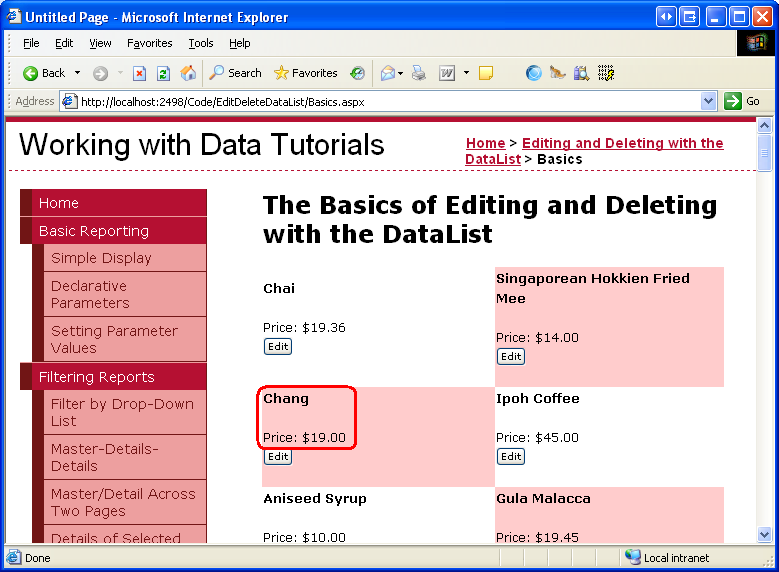 After updating Web.sitemap, take a moment to view the tutorials website through a browser. The menu on the left now includes items for the DataList editing and deleting tutorials.