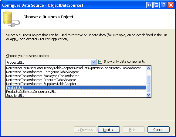 Figure 4: Configure the ObjectDataSource to Use the ProductsBLL Class (Click to view full-size image)