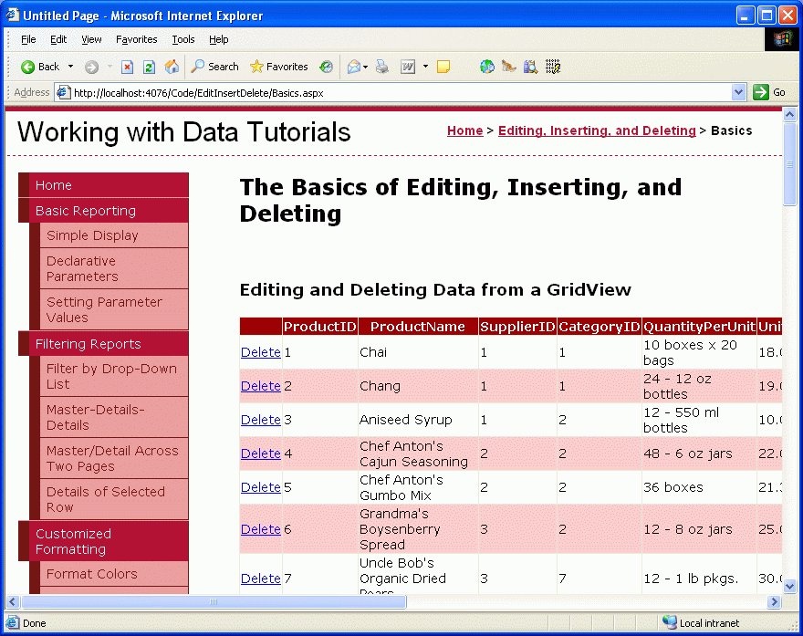 After updating Web.sitemap, take a moment to view the tutorials website through a browser. The menu on the left now includes items for the editing, inserting, and deleting tutorials.