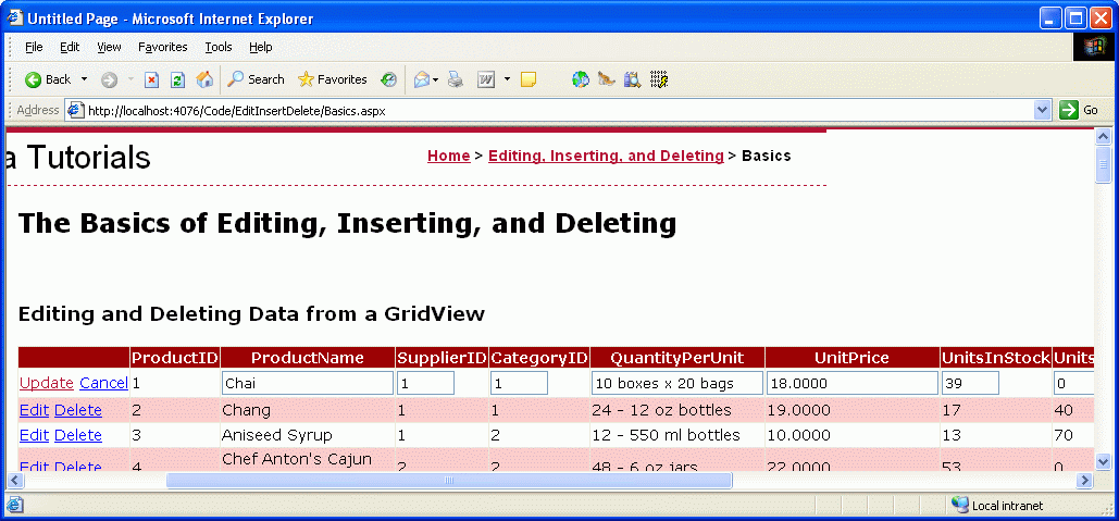 Figure 23 shows the FormView in a browser after the Edit button has been clicked for Chai. Note that the SupplierName and CategoryName fields shown in the ItemTemplate are no longer present, as we just removed them from the EditItemTemplate. When the Update button is clicked the FormView proceeds through the same sequence of steps as the GridView and DetailsView controls.