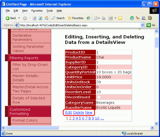 Figure 22: The Defaut FormView ItemTemplate Lists Each Product Field Along with New, Edit, and Delete Buttons (Click to view full-size image)