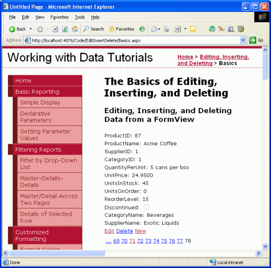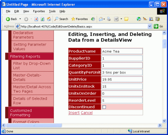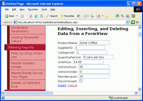 Figure 24 shows the FormView in a browser when adding a new product, Acme Coffee. Note that the SupplierName and CategoryName fields shown in the ItemTemplate are no longer present, as we just removed them. When the Insert button is clicked the FormView proceeds through the same sequence of steps as the DetailsView control, adding a new record to the Products table. Figure 25 shows Acme Coffee product's details in the FormView after it has been inserted.