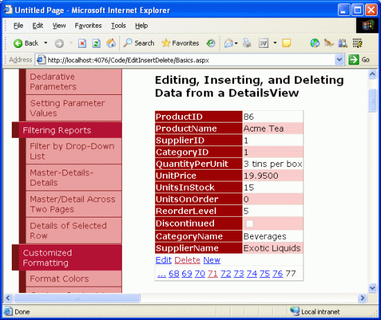 Figure 25: The Details for New Product, Acme Coffee, are Displayed in the FormView (Click to view full-size image)