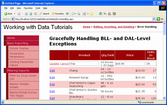 Figures 9 and 10 show a graceful way to handle exceptions raised due to invalid user input. Ideally, though, such invalid input will never reach the Business Logic Layer in the first place, as the ASP.NET page should ensure that the user's inputs are valid before invoking the ProductsBLL class's UpdateProduct method. In our next tutorial we'll see how to add validation controls to the editing and inserting interfaces to ensure that the data submitted to the Business Logic Layer conforms to the business rules. The validation controls not only prevent the invocation of the UpdateProduct method until the user-supplied data is valid, but also provide a more informative user experience for identifying data entry problems.