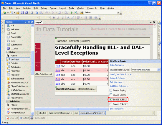 Finally, check the Enable Editing checkbox from the GridView's smart tag. After completing these steps the ErrorHandling.aspx page's Designer should look similar to Figure 4.