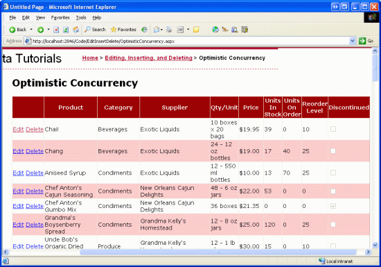 With these changes, we are now able to successfully delete and edit product information! In Step 5 we'll look at how to verify that concurrency violations are being detected. But for now, take a few minutes to try updating and deleting a few records to ensure that updating and deleting for a single user works as expected.