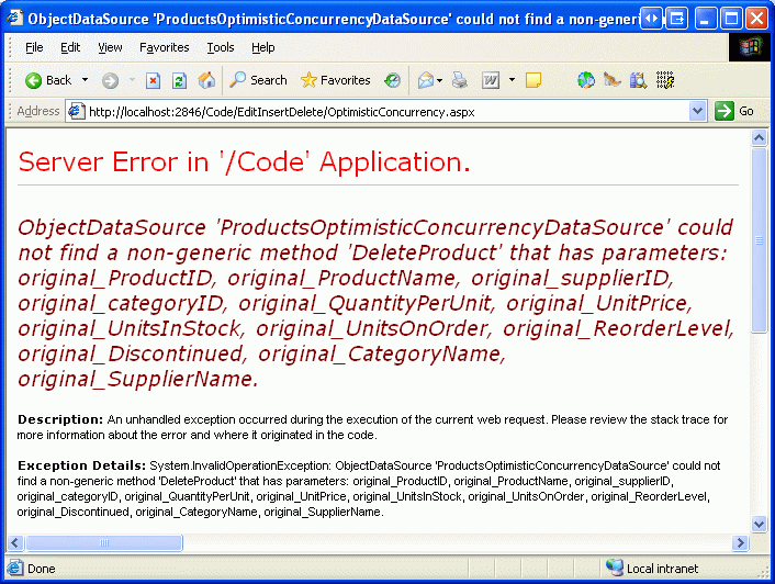 After solving this problem, try clicking the Delete button for any product again. This time you'll get an InvalidOperationException when the ObjectDataSource attempts to invoke the BLL's UpdateProduct method.